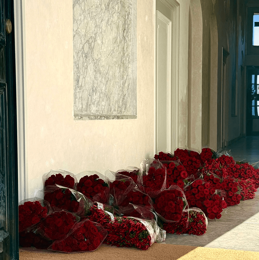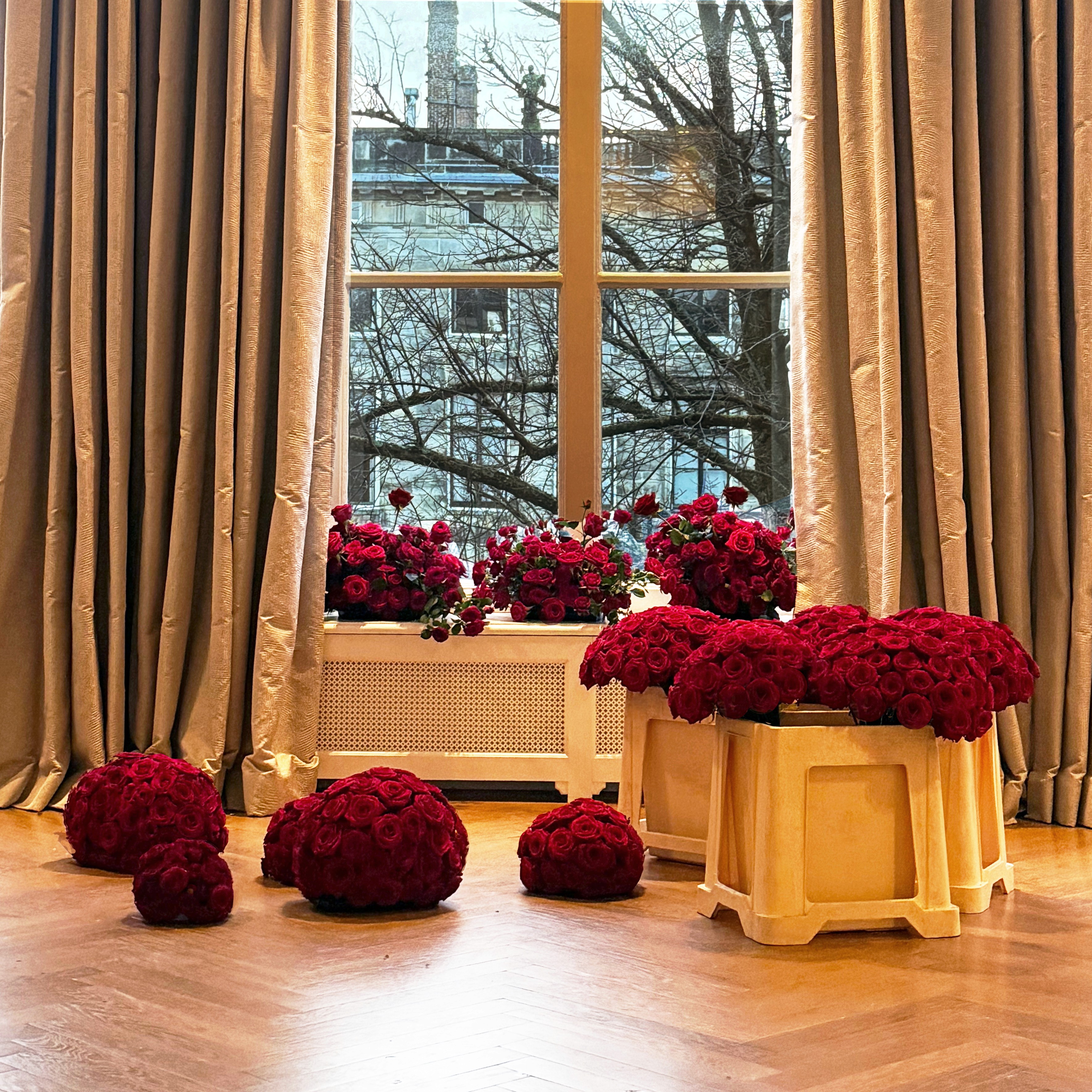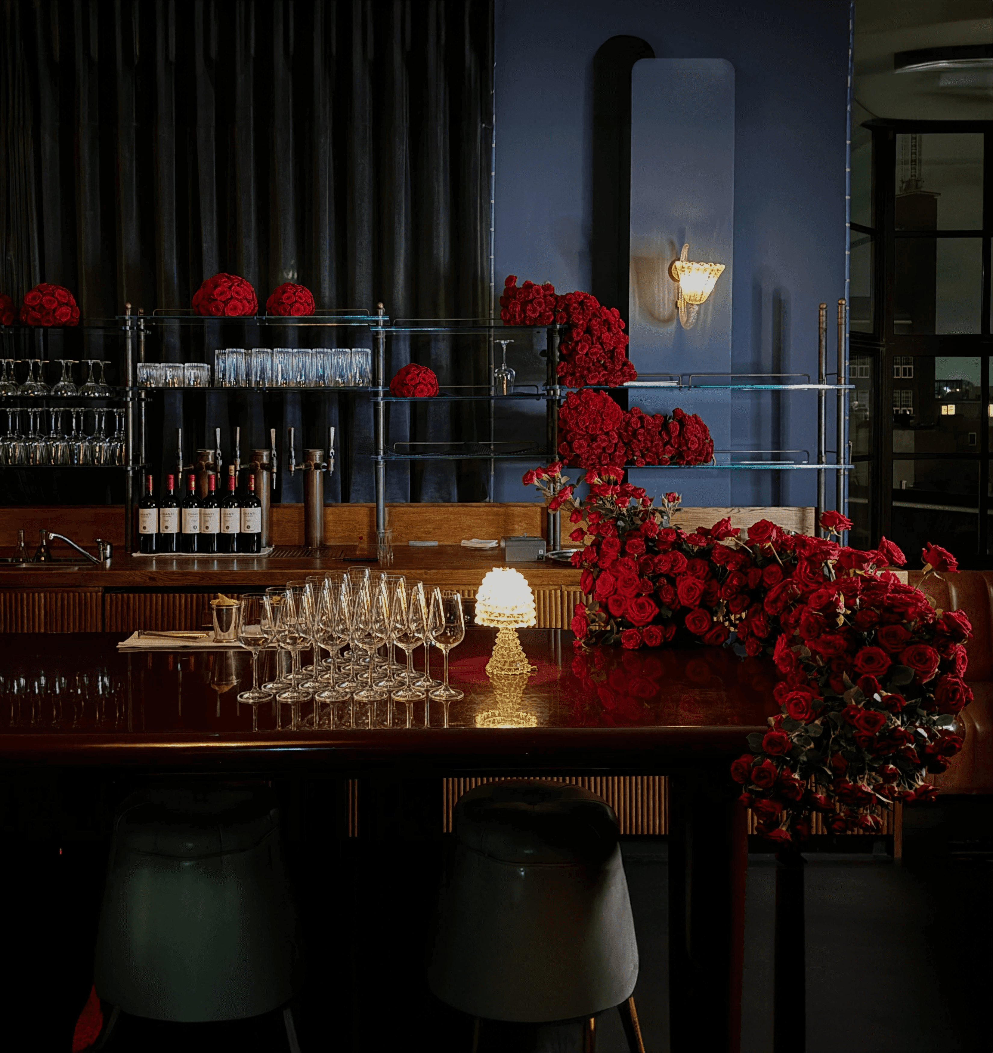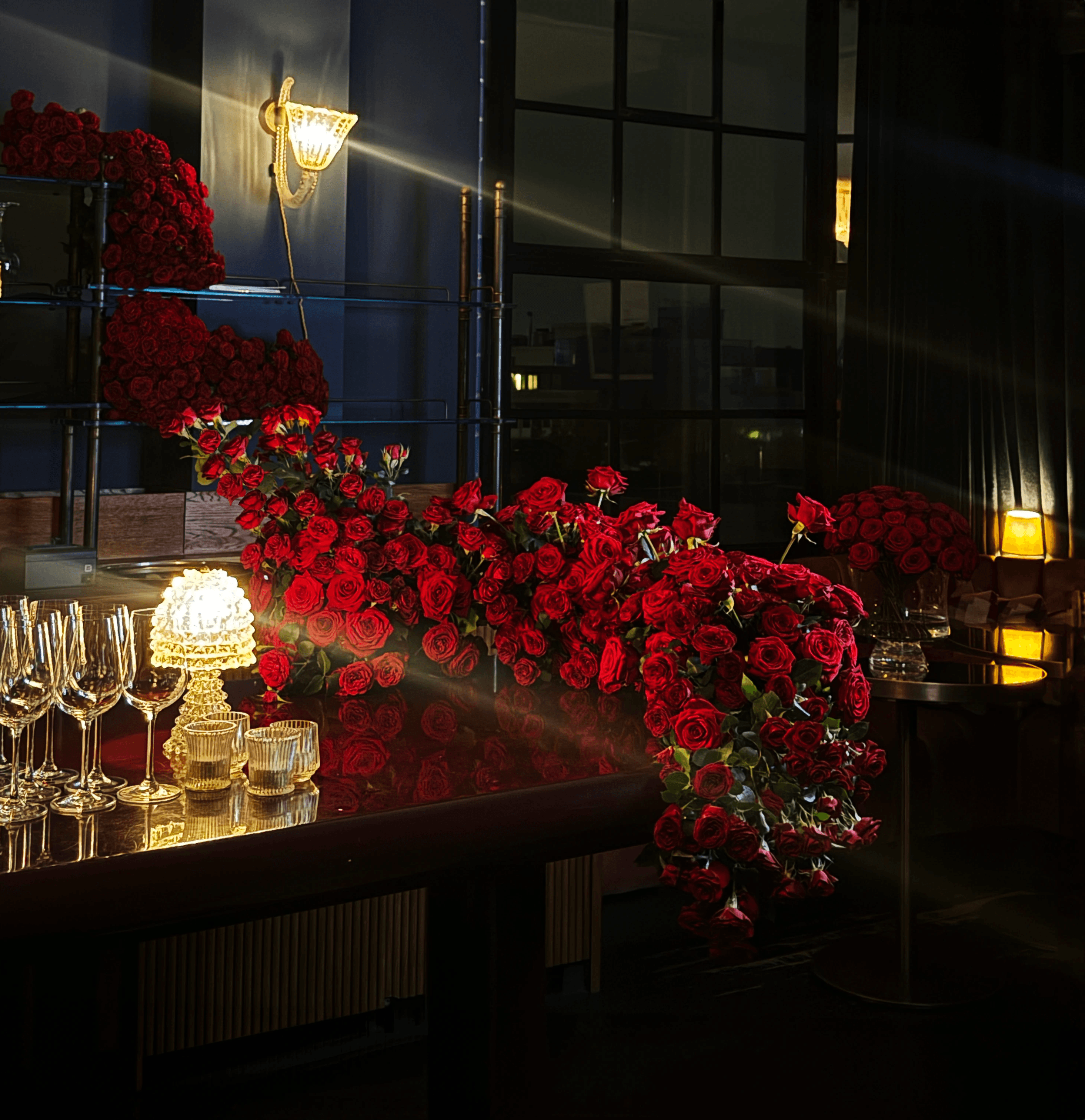 Sculptural rose spheres were placed throughout the space, while a sweeping cascade of roses draped across the bar - a modern expression of abundance, emotion, and heritage.