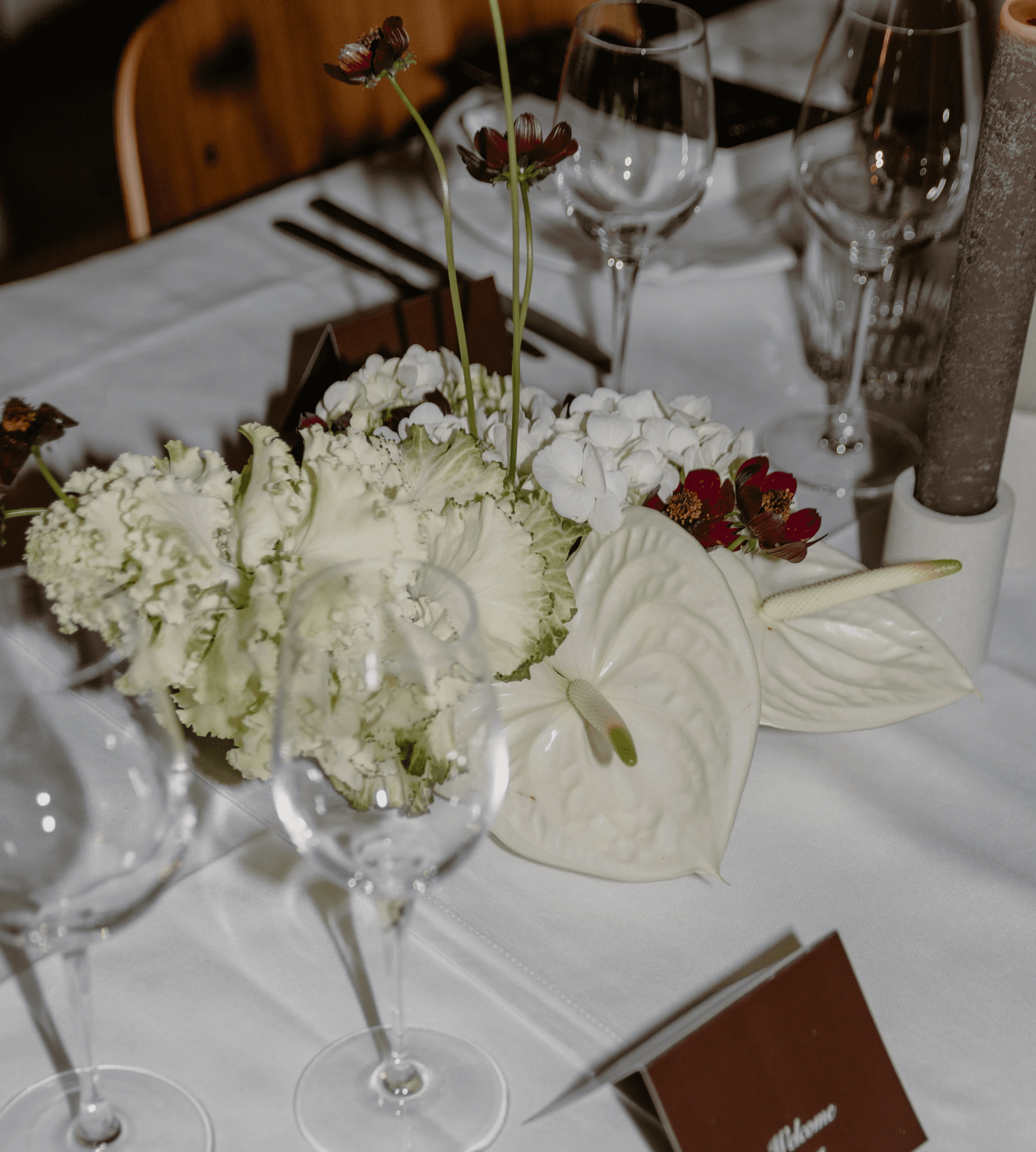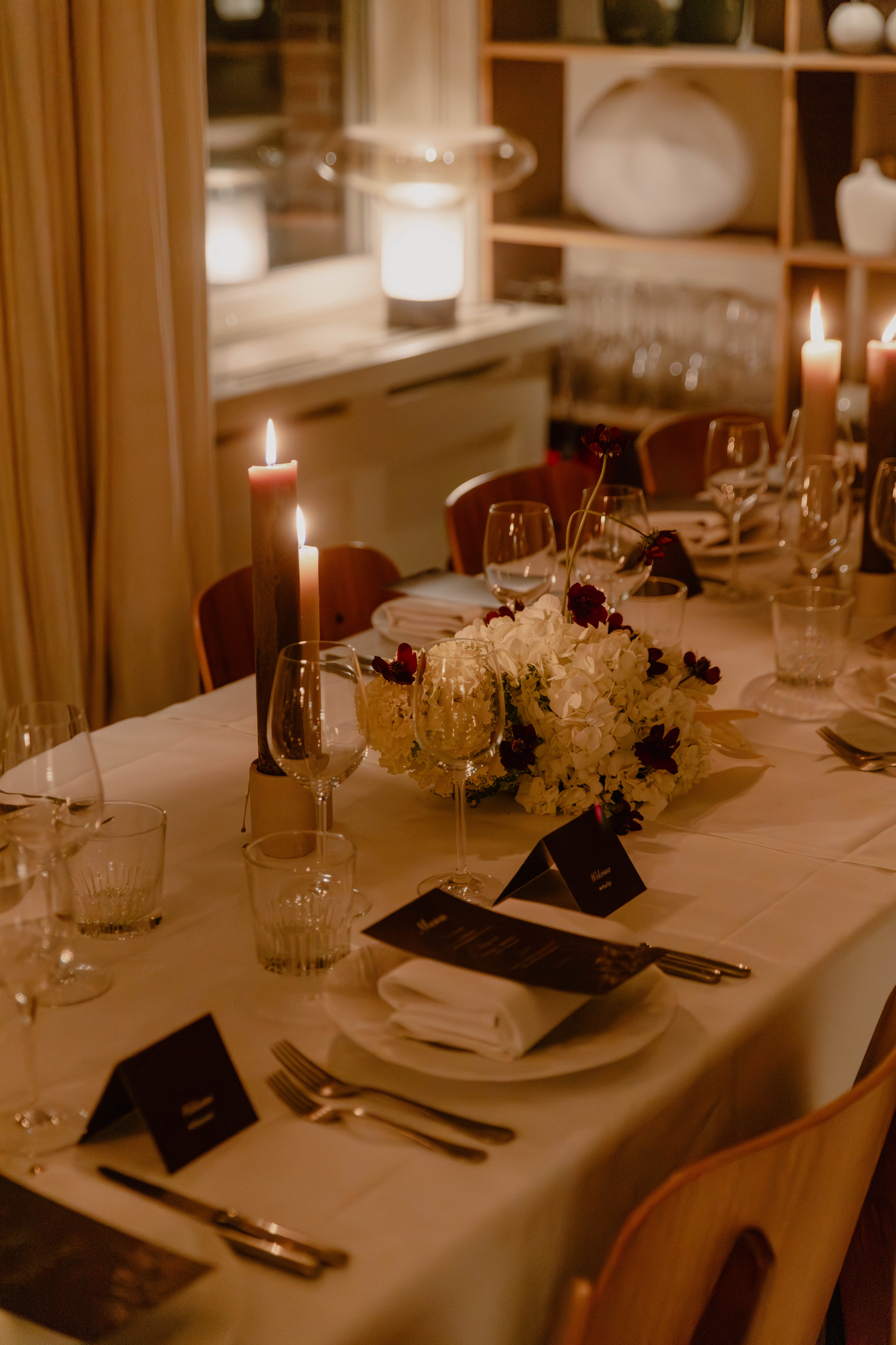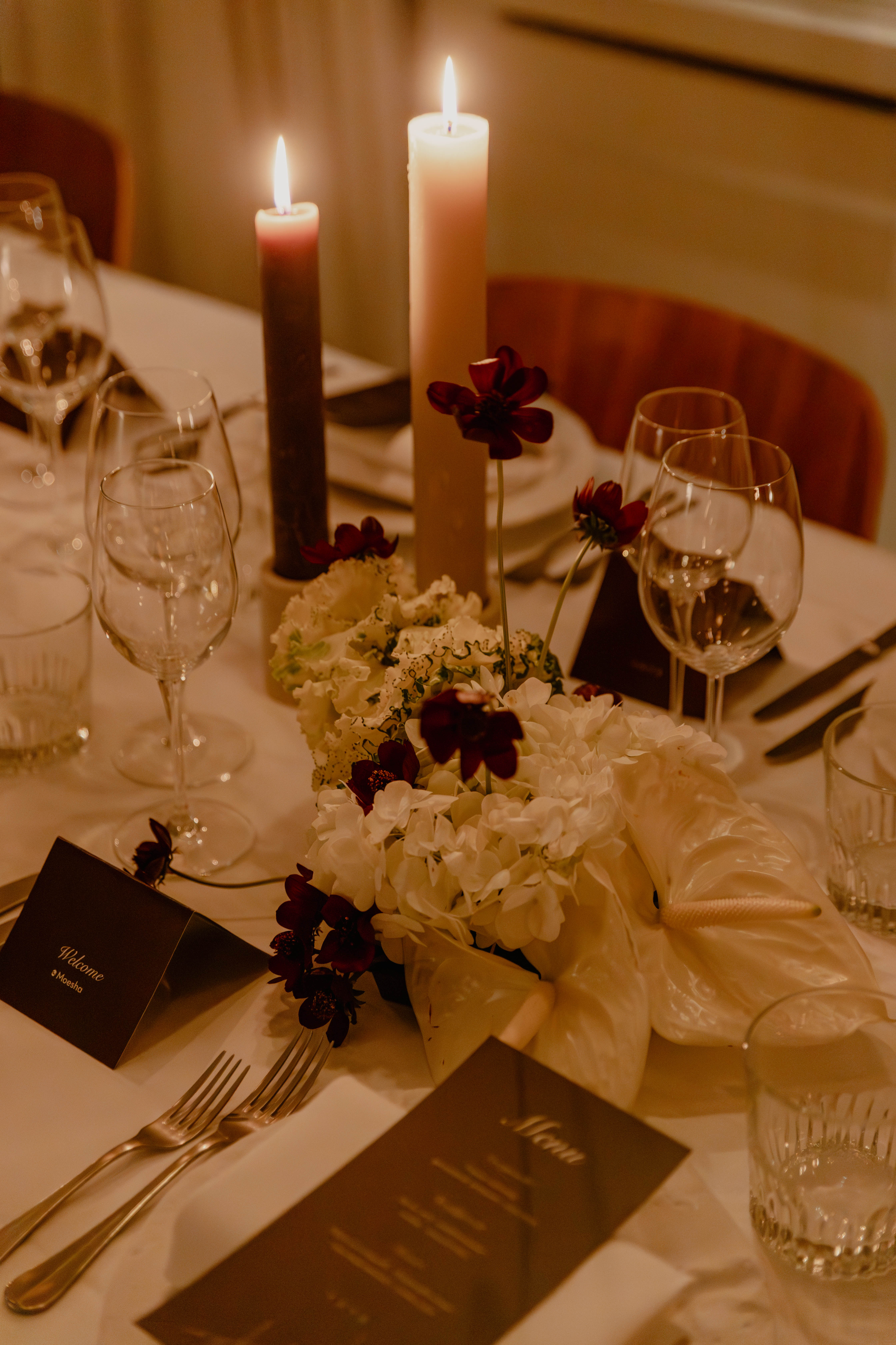 The evening unfolded around a long, candlelit table dressed in sculptural florals: soft ivory hydrangeas and ruffled edges of kale as the memory of autumn, and deep burgundy cosmos weaving depth into the palette as a main colour of a new collection. Nestled between warm candle pillars and delicate glassware, the arrangements set a tone of understated luxury - a balance of comfort, craft, and festive anticipation.